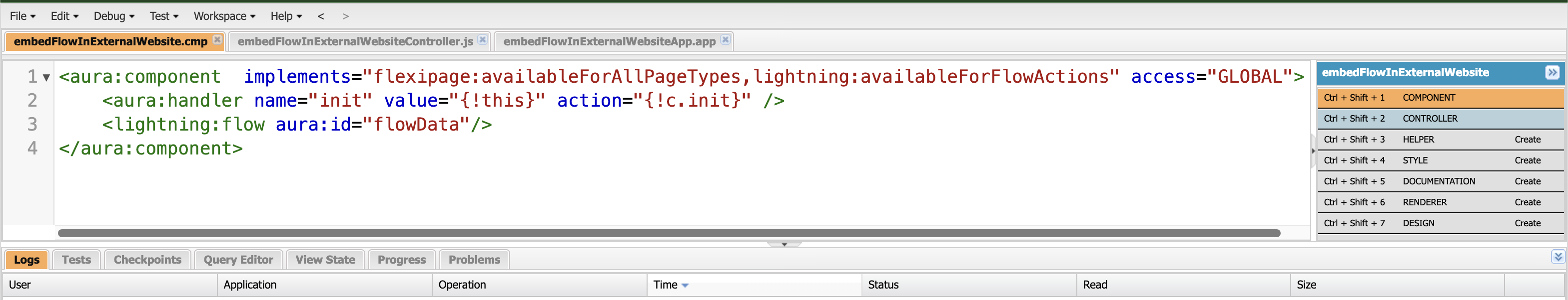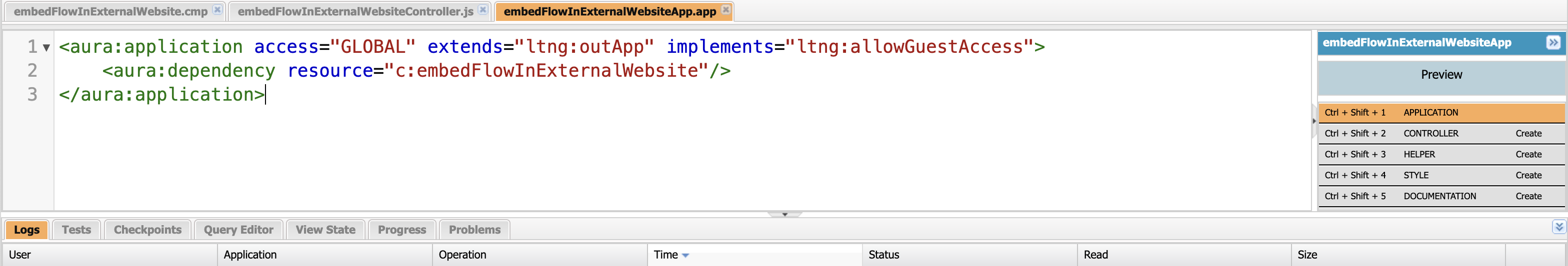 <aura:application access="GLOBAL" extends="ltng:outApp" implements="ltng:allowGuestAccess"> <aura:dependency resource="c:embedFlowInExternalWebsite"/> </aura:application> - Go to ‘File’ -> Save All.